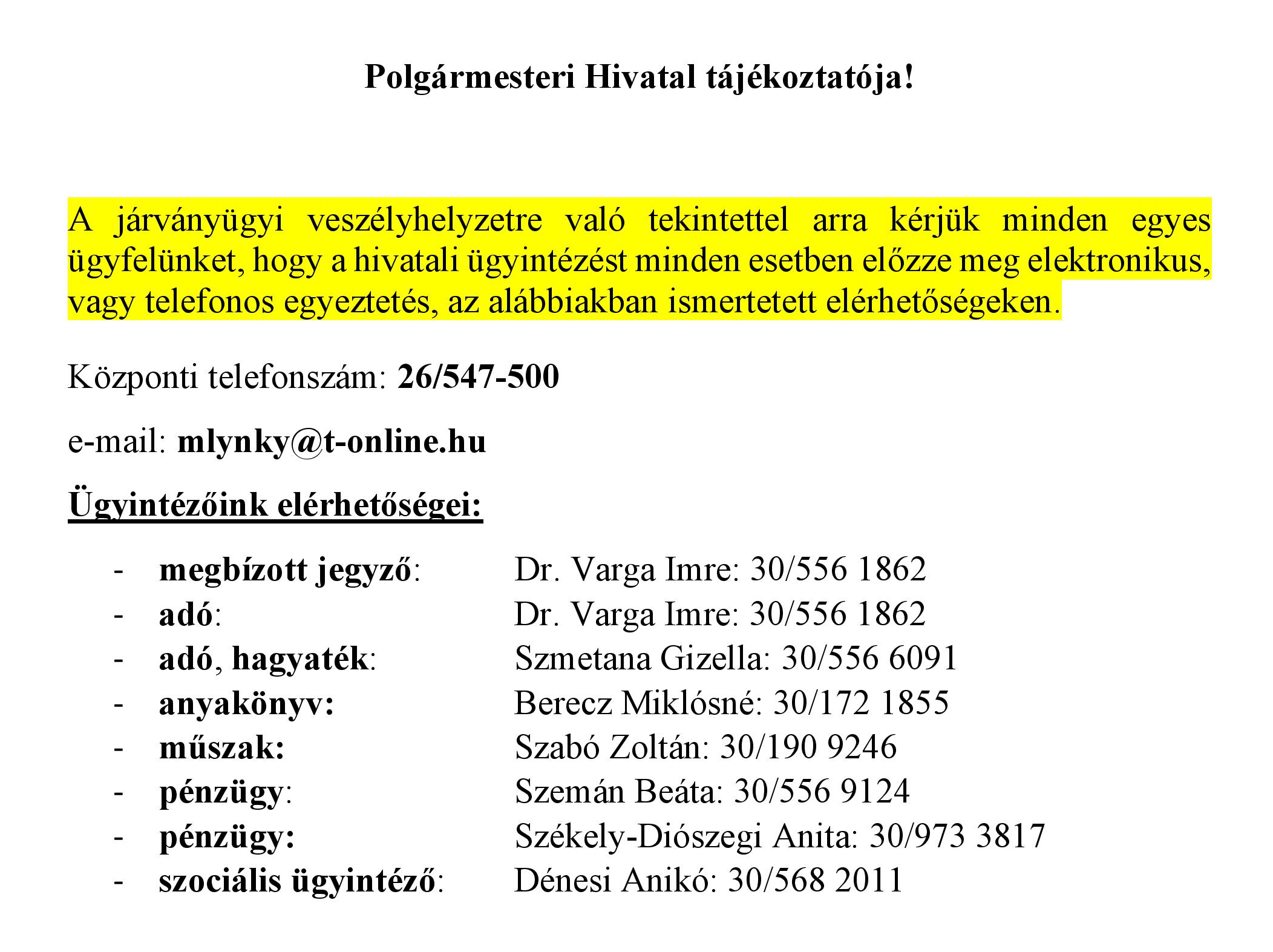Polgármesteri Hivatal tájékoztatója