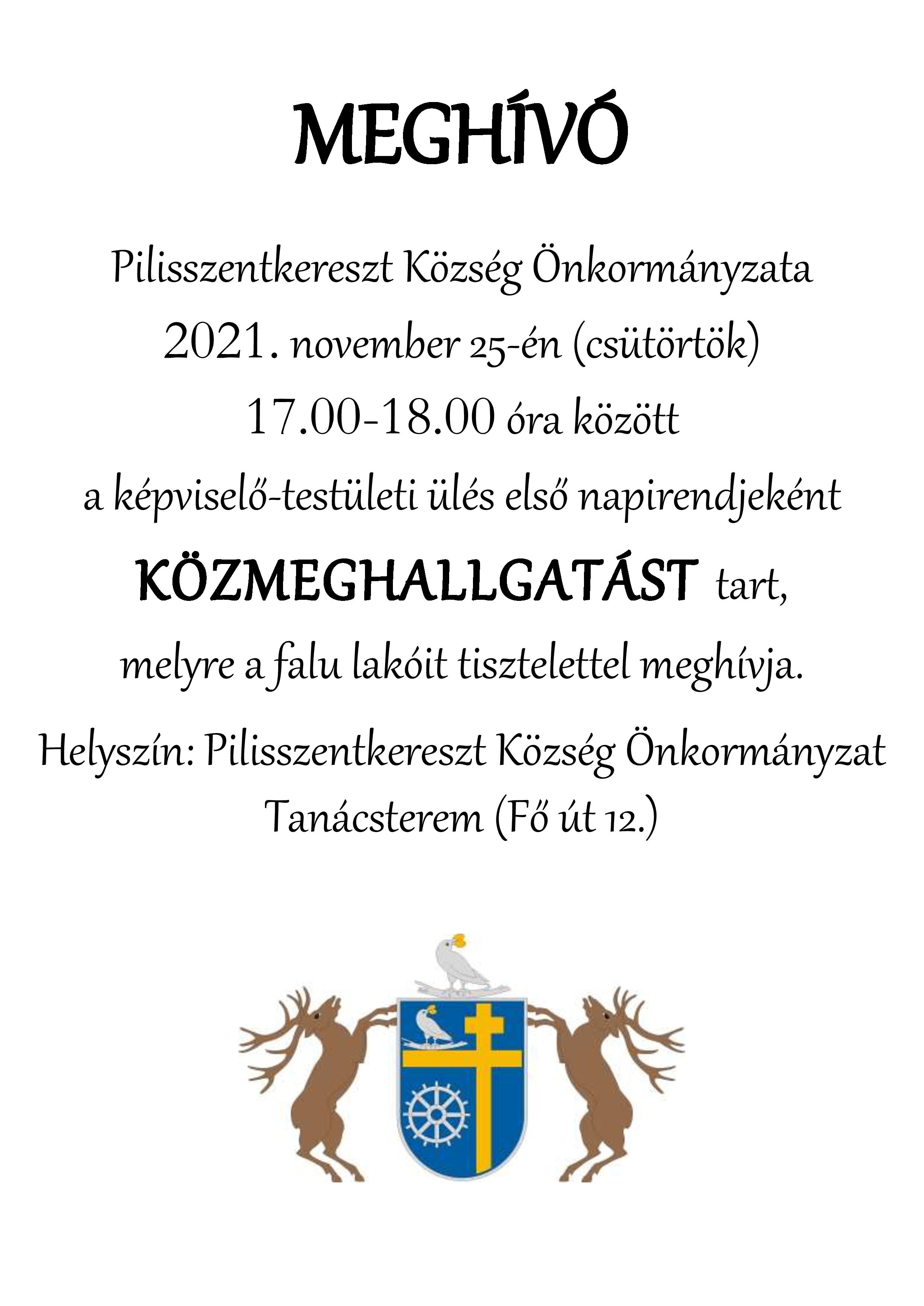 2021. november 25-én (csütörtök) 17.00 órakor közmeghallgatással egybekötött testületi ülést tart, melyre tisztelettel meghívom.