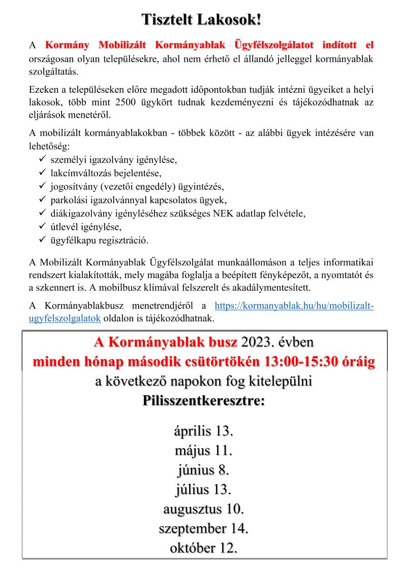 Kormányablak busz kitelepülése Pilisszentkeresztre